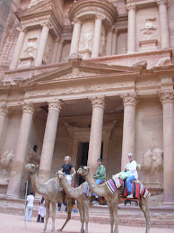 Day 5: Petra is wonderful. It is an amazing series of buildings, located at Wadi Musa, that were carved out of solid rose-red rock by the Nabataeans, an Arab civilization that lived there more than 2000 years ago. It was eventually claimed as a part of the Roman Empire, but was forgotten by the West by the beginning of the 14th Century and was only rediscovered in 1812 by a Swiss traveler who was looking for the ancient city of Petra. We rode horses as close as we could and then proceeded on foot to the Siq, the narrow slot in the rock that opens up to the magnificent Treasury Building. Local Bedouins operate the horse, donkey, and camel concessions - the camel ride I took with River and Joachin was outstanding.